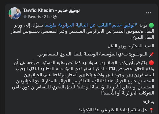 « La Constitution algérienne affirme clairement que tous les citoyens sont égaux. Cependant, dans la pratique, il existe une discrimination manifeste dans la politique tarifaire de l’Entreprise Nationale de Transport Maritime de Voyageurs, qui applique des prix plus élevés aux Algériens résidant à l’étranger lorsqu’ils achètent leurs billets depuis l’Algérie, comparativement aux résidents en Algérie. » écrit-il dans sa correspondance.
